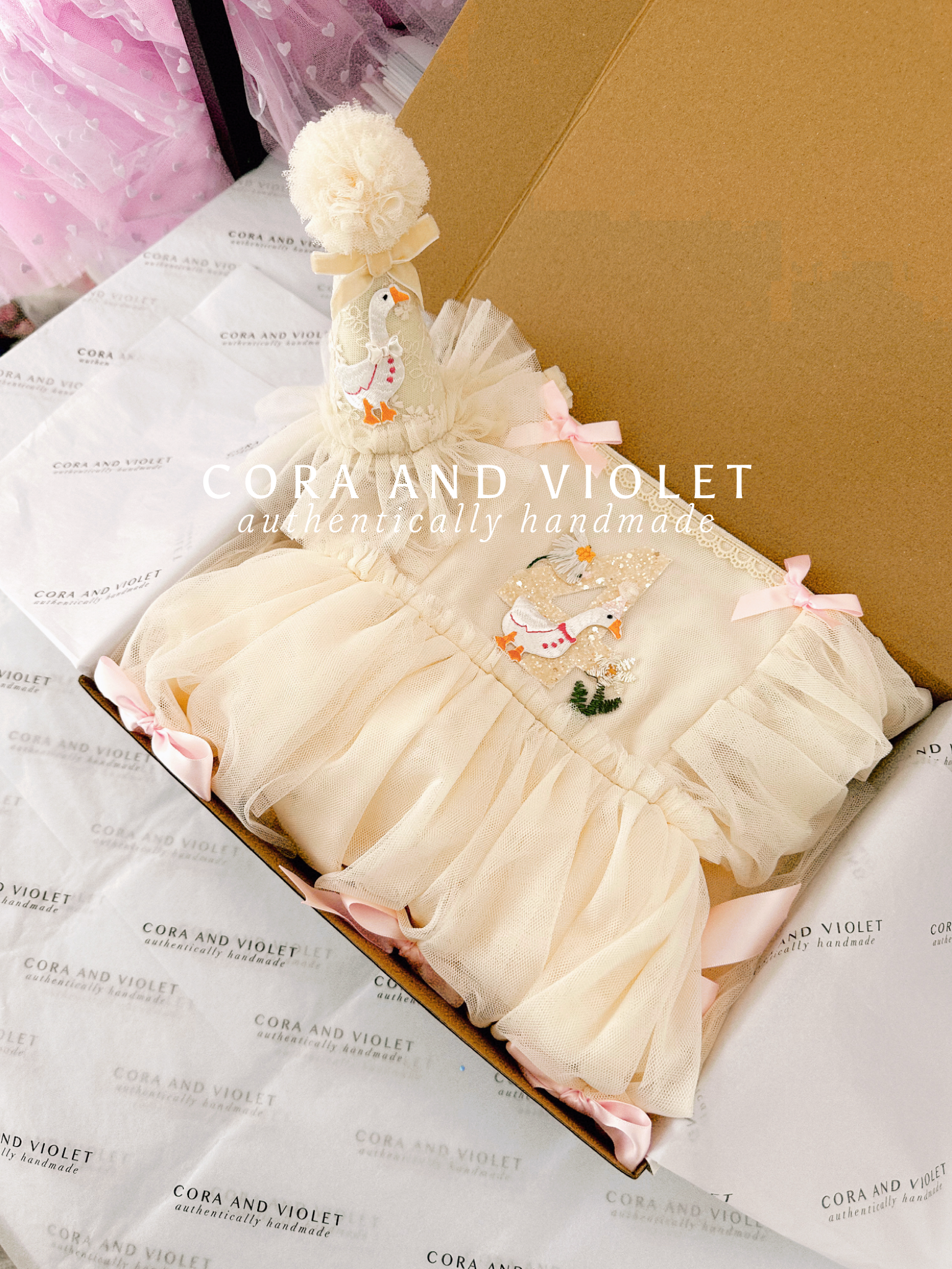 Celebrate her milestone with an original. Our signature Silly Goose design is an artisanal blend of whimsy and heritage. Each dress features a hand-detailed goose motif nestled among delicate florals, perfectly tailored for first birthdays and cherished portraits.