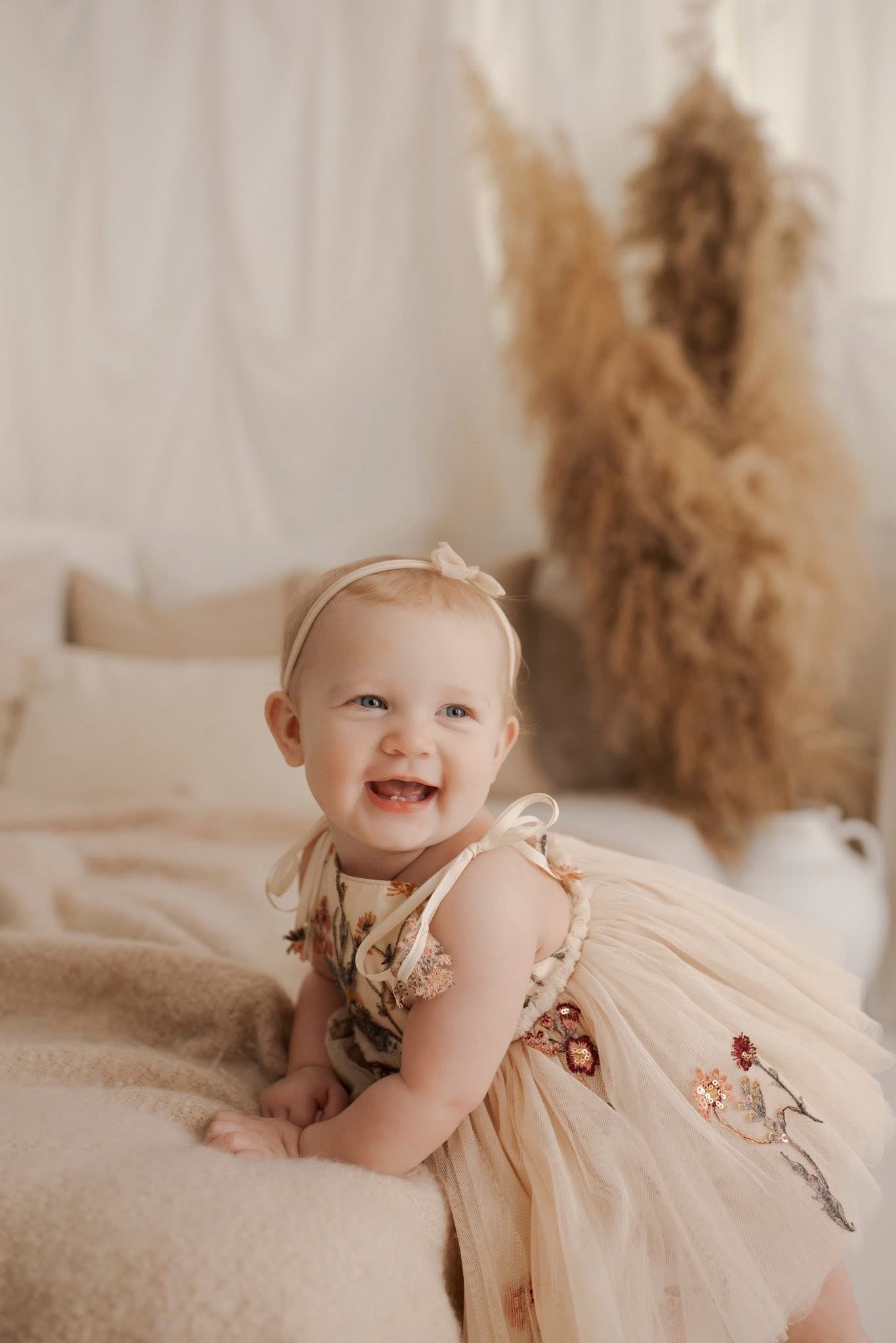 Dimensional Texture: The combination of 3D embroidery and ruched tulle creates a stunning depth that is a dream for milestone photography.