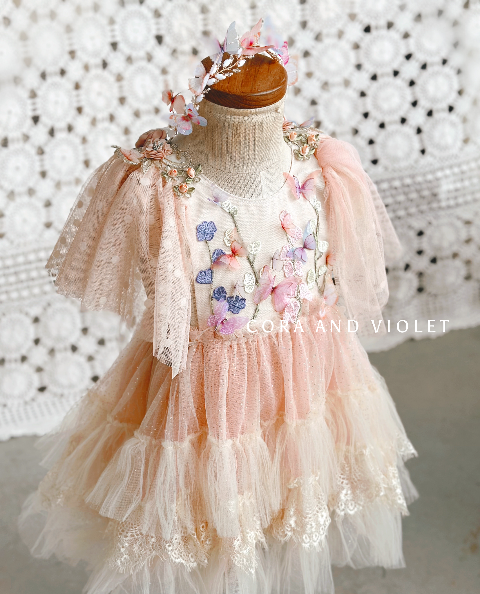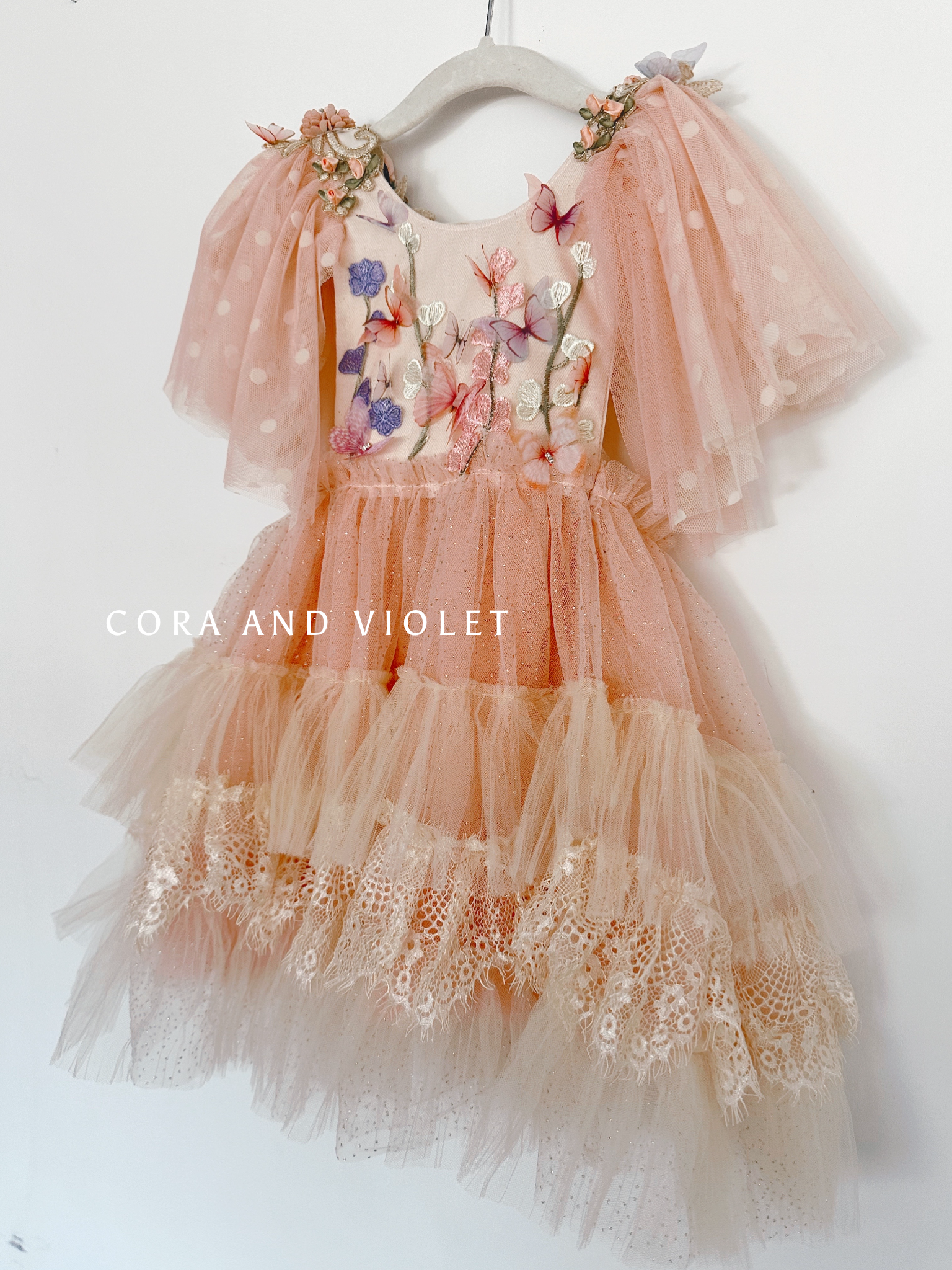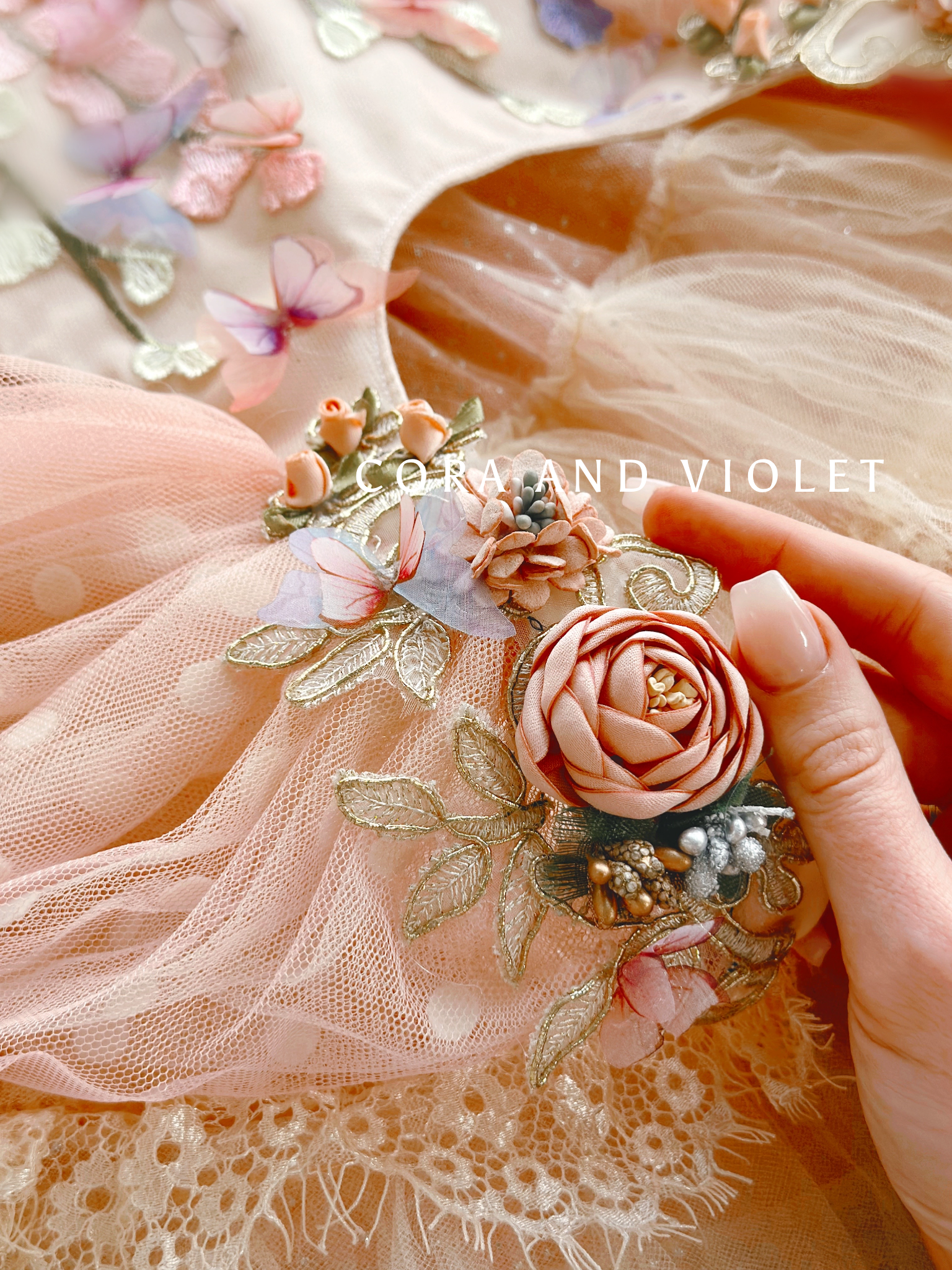 Say hello to this spring delight of embroidered flowers atop layered blush and cream tulle, flirting under a delightful bed of lavender, wildflowers and butterflies cresting over the adorned sleeves.