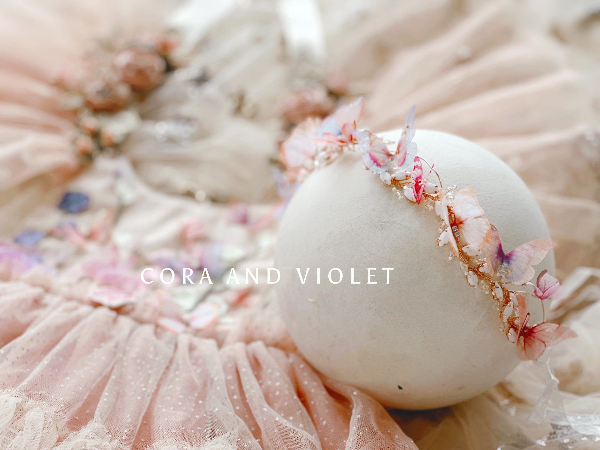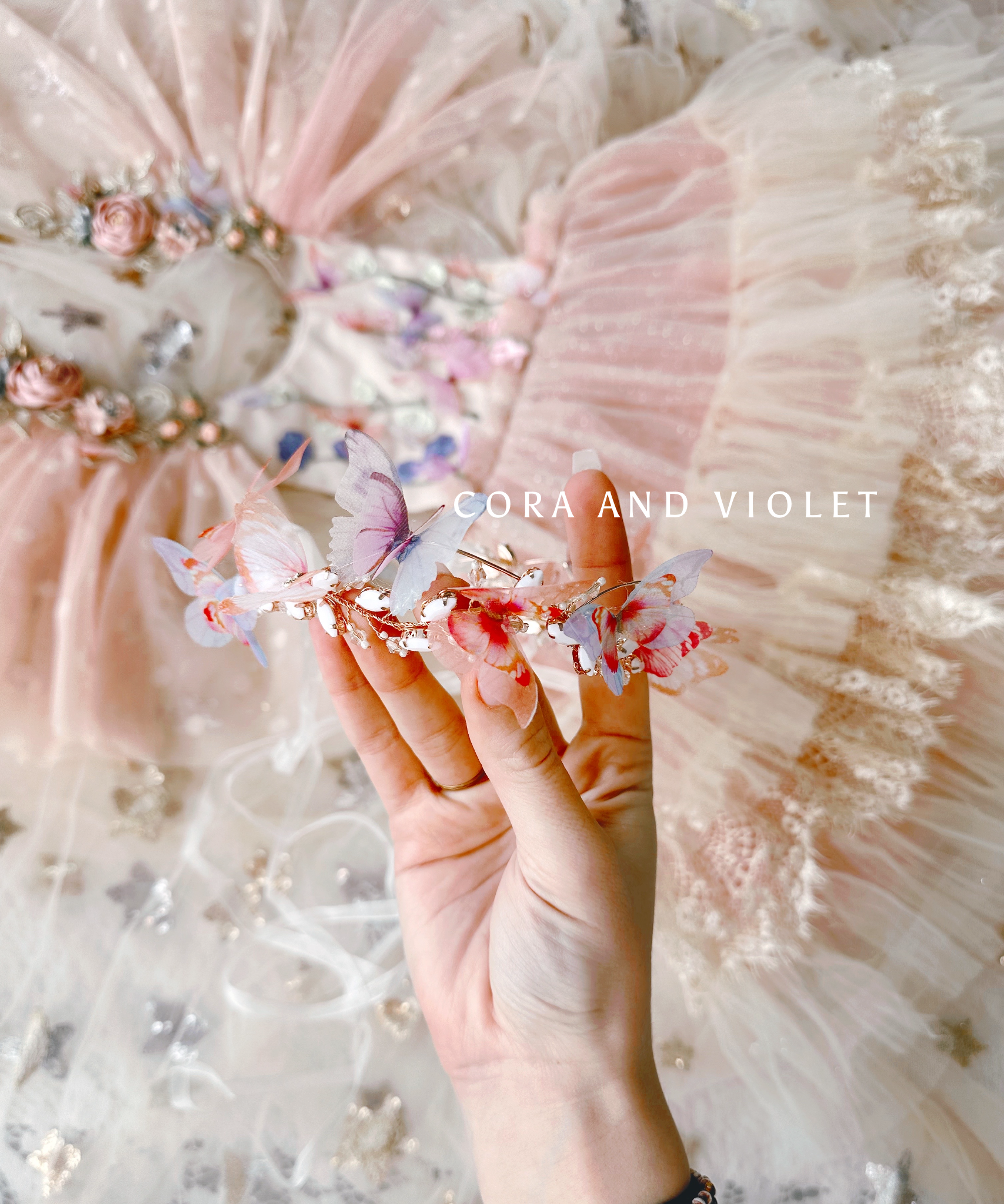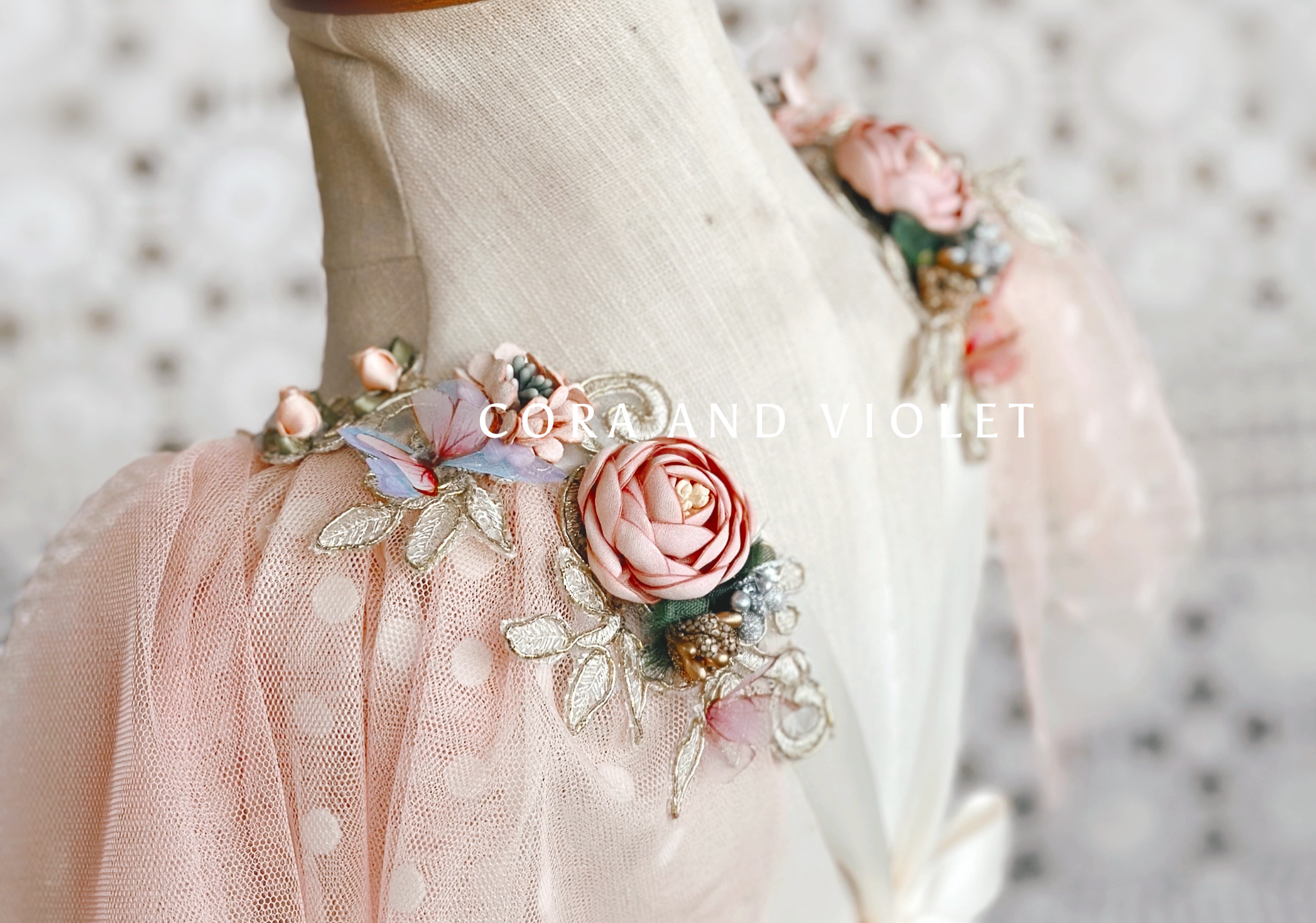Say hello to this spring delight of embroidered flowers atop layered blush and cream tulle, flirting under a delightful bed of lavender, wildflowers and butterflies cresting over the adorned sleeves.
