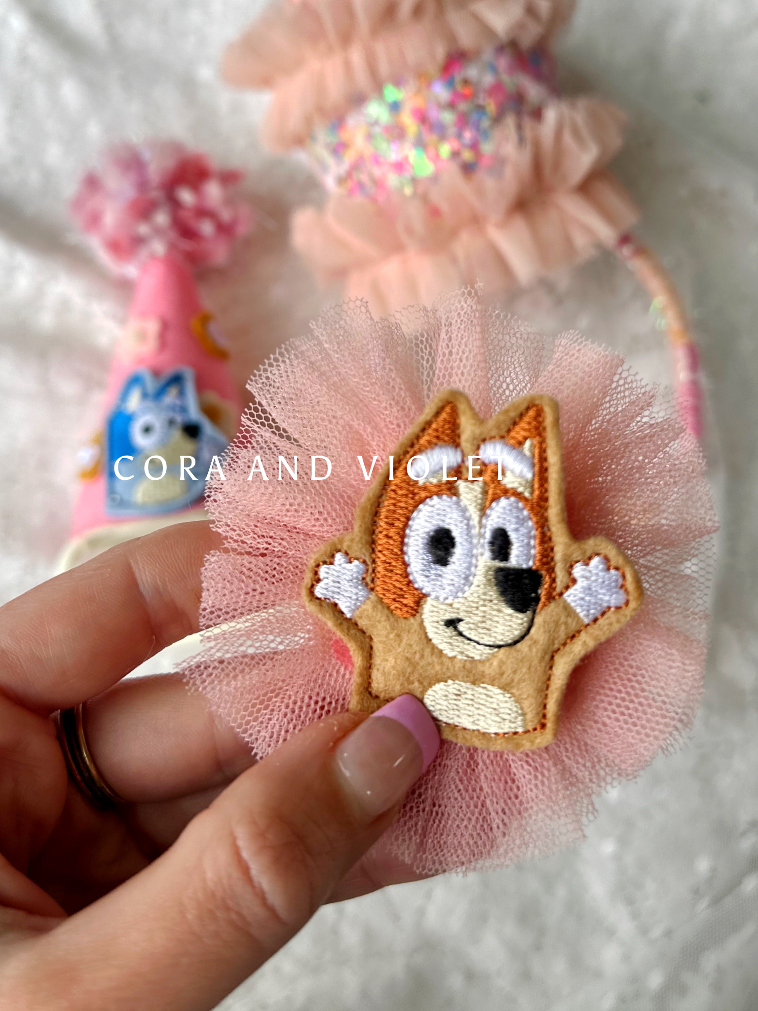 Atop a soft bed of pink hand-gathered and sewn tulle and a satin-lined alligator clip.