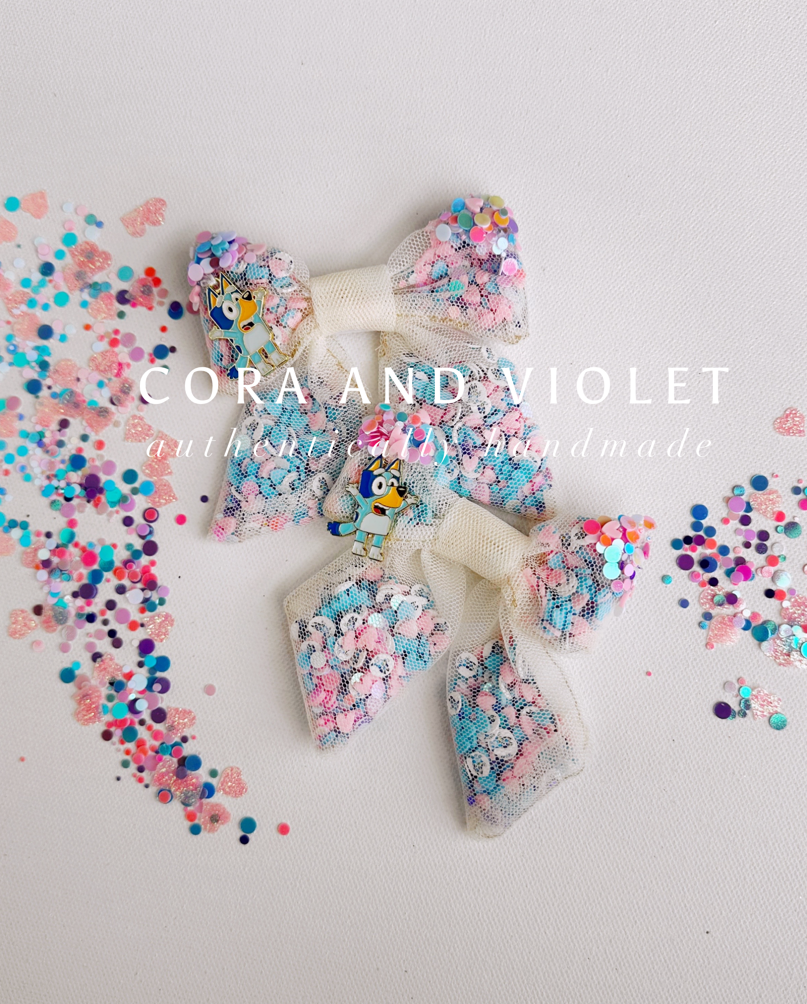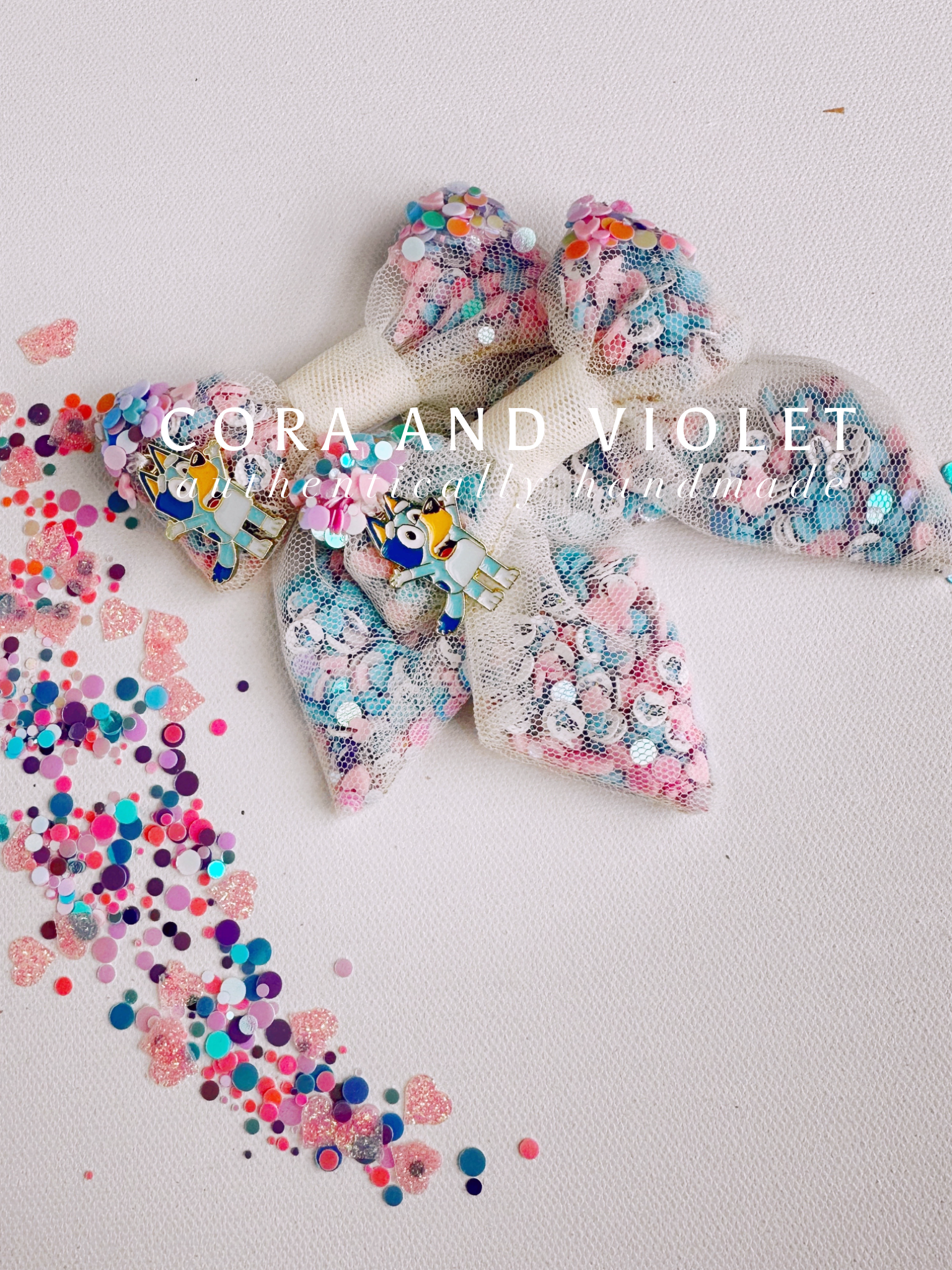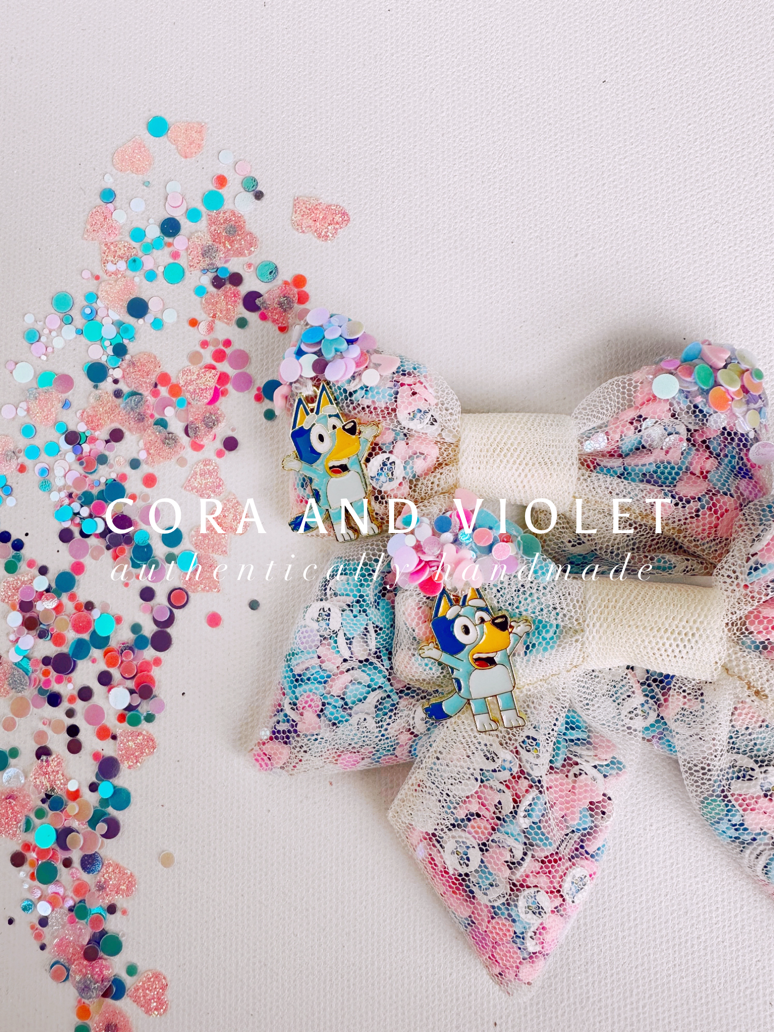 Hand stitched Bluey, pastel iridescent sparkles and hundreds of Bluey charms sewn inside!