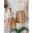 Bask under the moonlight with this darling star tulle skirt of golden browns with glossy gold star flecks.