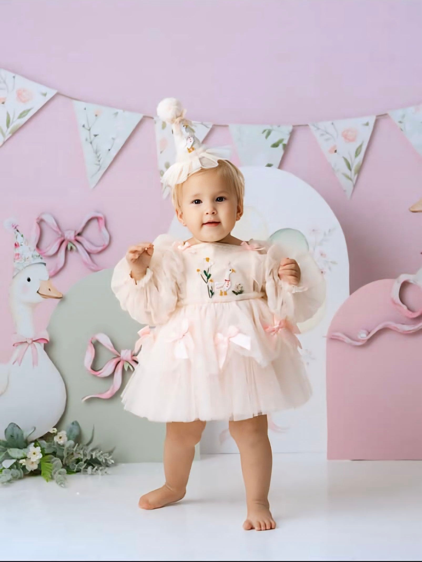 Celebrate her milestone with an original. Our signature Silly Goose design is an artisanal blend of whimsy and heritage. Each dress features a hand-detailed goose motif nestled among delicate florals, perfectly tailored for first birthdays and cherished portraits.